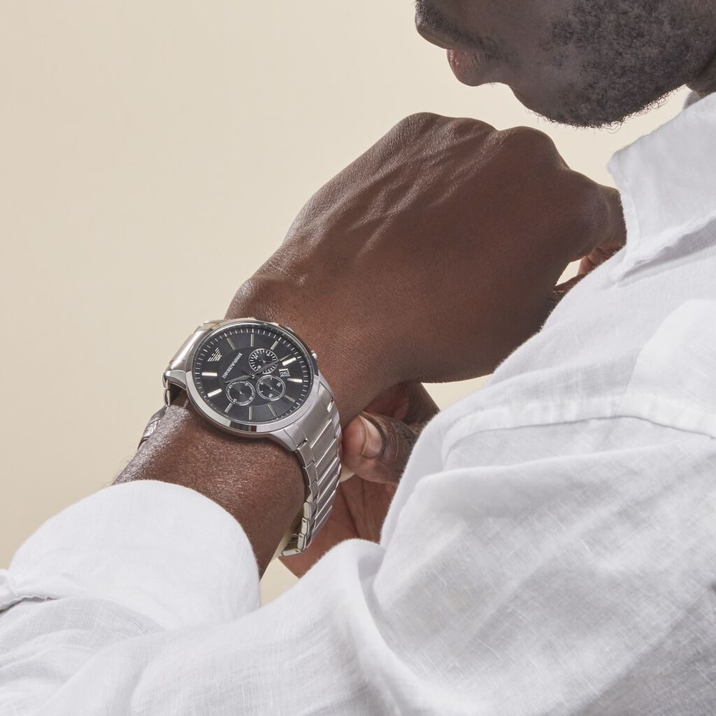 تجسد ساعة امبوريو ارماني ريناتو AR2434 معنى الأناقة الرجالية الكلاسيكية. المينا السوداء العميقة مع السوار المعدني الفضي تمنحك حضورًا قويًا يناسب الاجتماعات الرسمية والمناسبات الراقية.