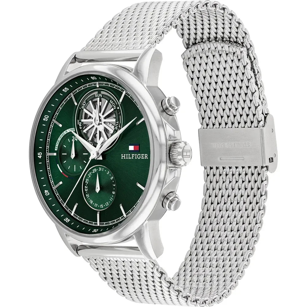 يتميز موديل تومي هيلفيغر ستيوارت بعرض نظري يجمع بين الأناقة والوظائف المتعددة، حيث يحتوي على عدادات فرعية تُظهر أيام الشهر والأسبوع بأسلوب مبتكر. التصميم المفتوح في الجزء العلوي يكشف عن الحركة الداخلية للساعة، مما يضيف لمسة فنية تجذب عشاق ساعات تومي هيلفيغر الذين يبحثون عن التميز في كل التفاصيل.