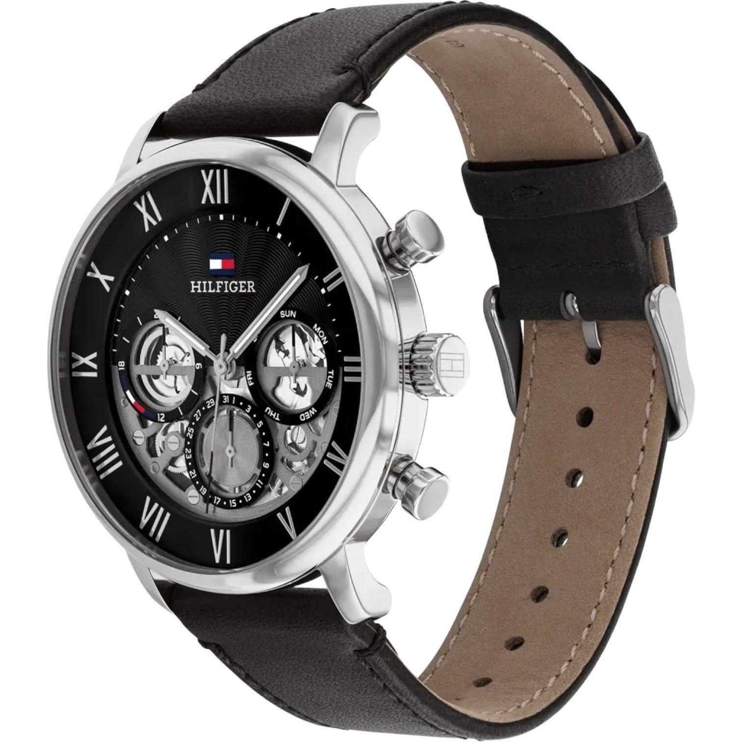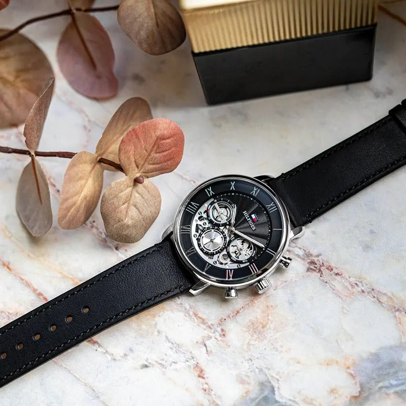تأتي ساعة تومي هيلفيغر ليجند بتصميم أنيق يجمع بين الفخامة والبساطة العصرية، حيث يمنحك المينا الأسود مظهرًا كلاسيكيًا راقيًا، بينما يضيف السوار المصنوع من الجلد الطبيعي الأسود لمسة رسمية تناسب العمل والمناسبات الخاصة.